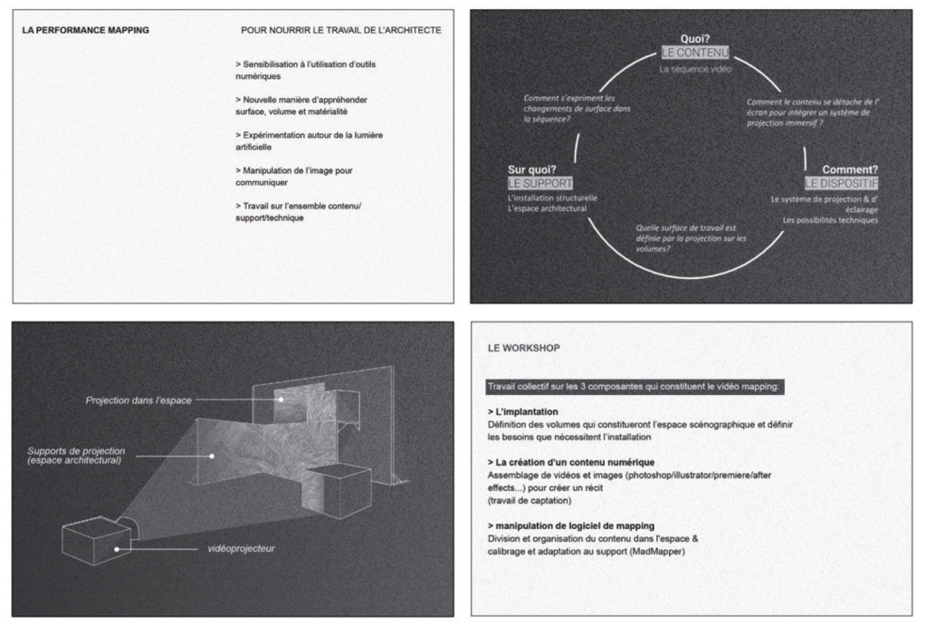 – S’approprier la vidéoprojection comme un outil d’expression du projet, au même titre que le dessin, l’écriture, la maquette.